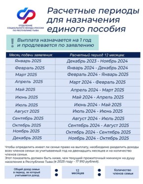 Отделение Социального фонда России по Туве информирует о порядке определения расчётного периода, используемого при назначении единого пособия на ребёнка.При оформлении единого пособия в рамках социальной поддержки семьи учитывается расчётный...