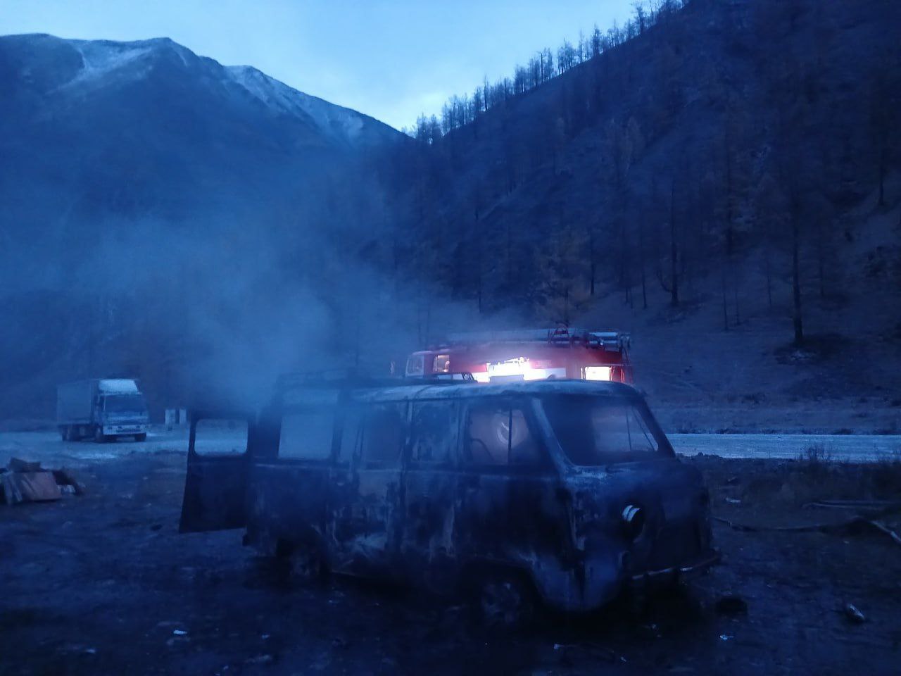 Пожарными в 60 км от села Мугур-Аксы Монгун-Тайгинского района потушено возгорание автомашины УАЗ-452. Травмирован 1 человек – водитель 36 лет, получил ожоги рук и лица, когда самостоятельно пытался потушить пожар. Причина пожара устанавливается, предварительно – короткое замыкание электропроводки автомашины.