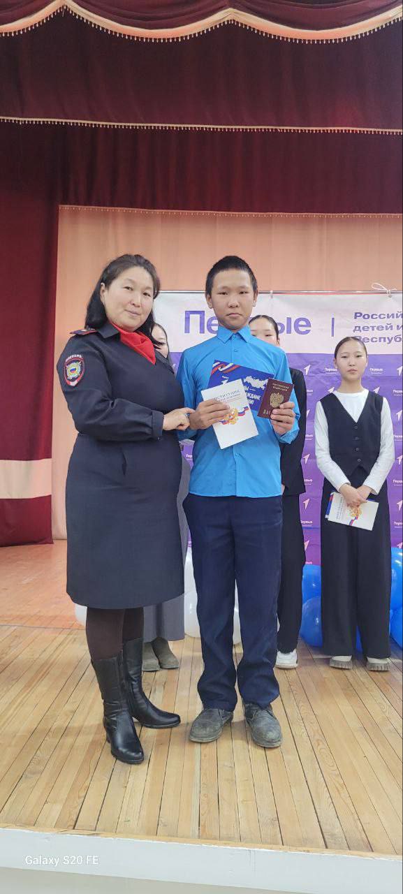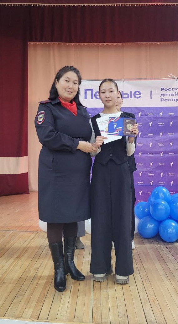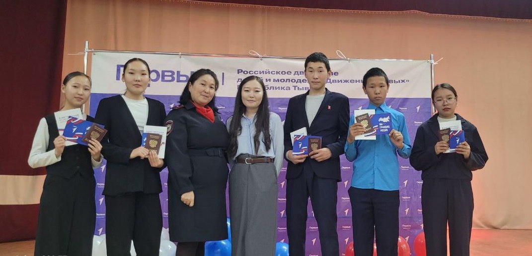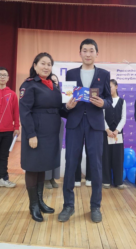 Главный документ в торжественной обстановке ребятам вручила инспектор по делам несовершеннолетних пункта полиции № 4 Межмуниципального отдела МВД России «Дзун-Хемчикский» майор полиции Ася Хертек, обложку на паспорт и значок «Движения Первых» - муниципальный координатор деятельности по Монгун-Тайгинскому району «Движения Первых» Айкыс Иргит.