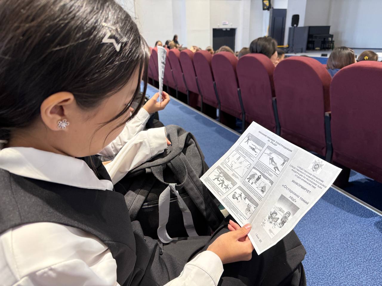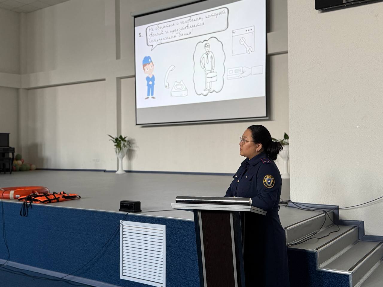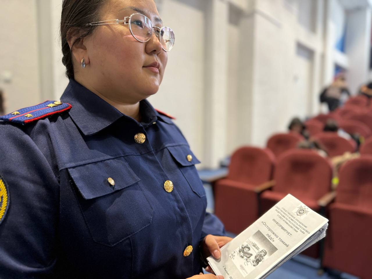 В рамках запланированных профилактических мероприятий по предупреждению и предотвращению несчастных случаев с участием несовершеннолетних в осенне–зимний период ледостава инспектор отдела криминалистки следственного управления СК России по Республике Тыва Эльтона Ондар совместно с сотрудниками Кызылского инспекторского участка Центра ГИМС МЧС России по Республике Тыва провели встречу с учащимися школы № 22 города Кызыла.