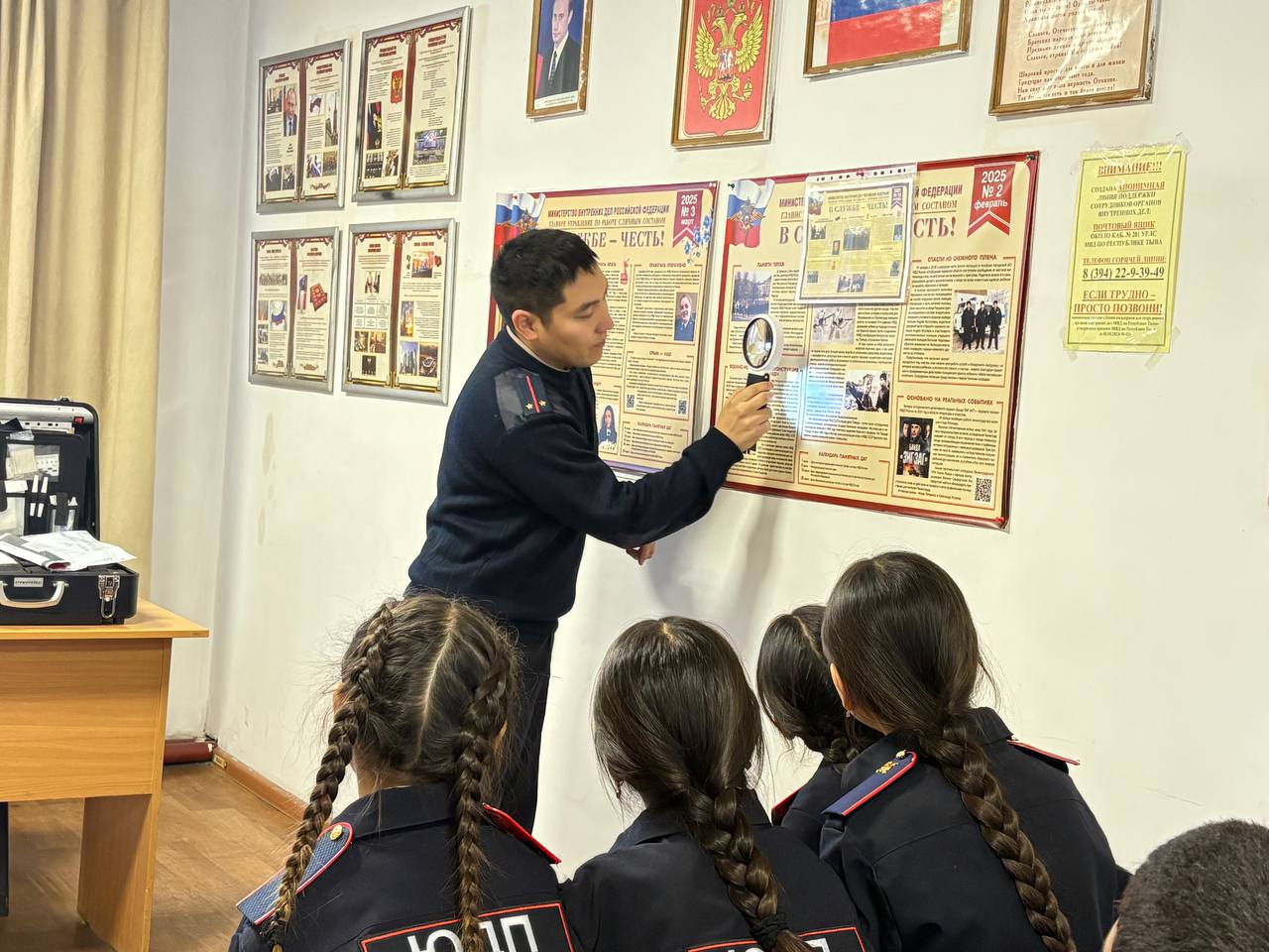 Продолжением мероприятия стала экскурсия в МО МВД России «Дзун-Хемчикский», где школьники познакомились с работой экспертно-криминалистической службы. Эксперт экспертно-криминалистического центра МВД по Республике Тыва лейтенант полиции Айдын Дамдын-оол продемонстрировал ребятам специальный унифицированный чемодан «Криминалист», где хранится набор средств, необходимых для фиксации и изъятия следов на местах происшествий.