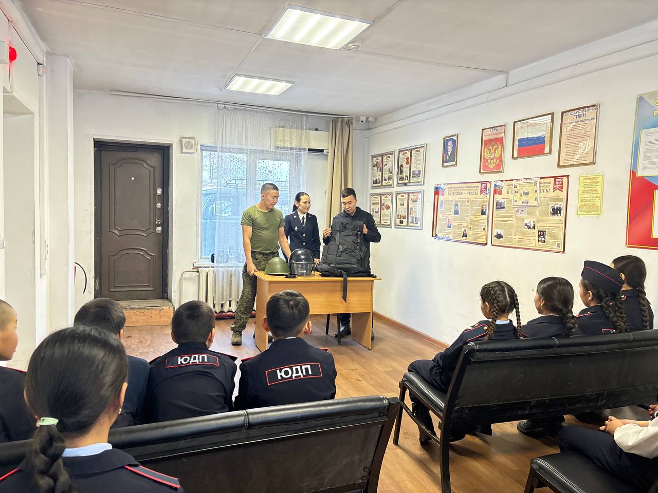 Особое внимание у школьников вызвал рассказ сотрудника ГРЛС Батыра Тагба и курсанта БЮИ МВД России младшего лейтенанта полиции Аржаана Ондара о специальных средствах и вооружении.