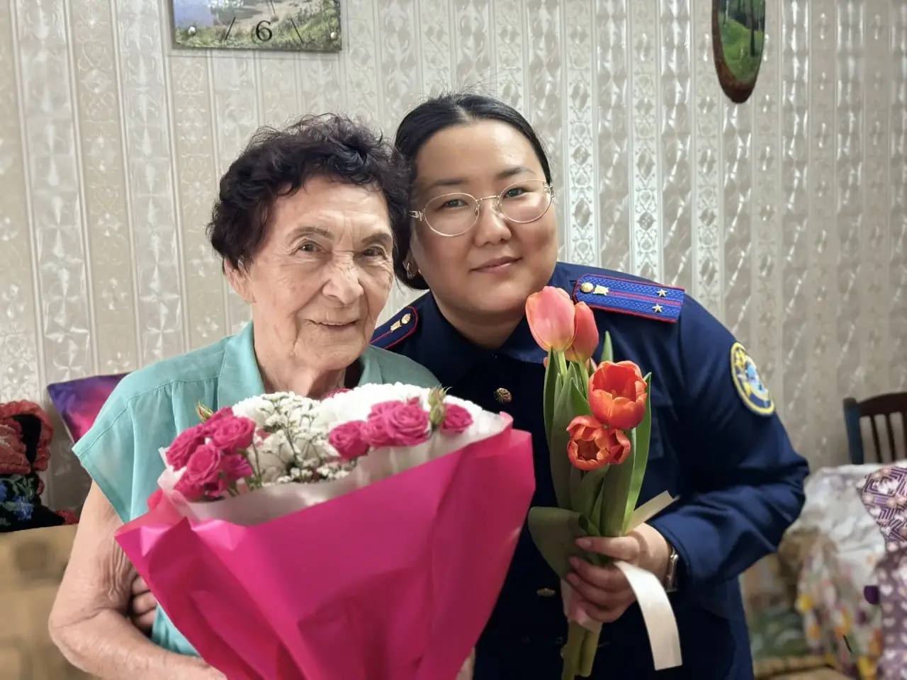В преддверии Международного женского дня сотрудник отдела криминалистики следственного управления СК России по Республике Тыва Эльтона Ондар и Эдуард Кара-Сал поздравили труженицу тыла – ветерана Великой Отечественной войны Валентину Федоровну Зябреву.