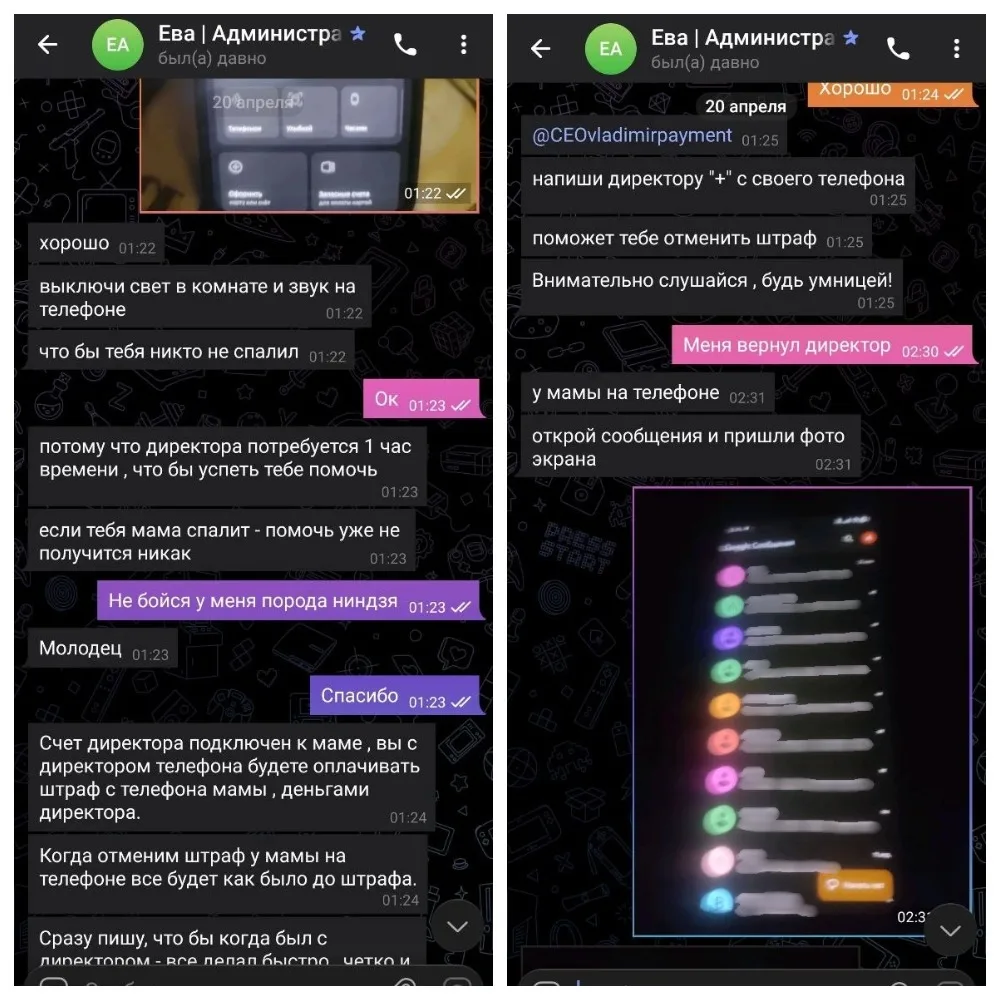В ходе выяснения обстоятельств сотрудники полиции установили, что на телефон мальчика в мессенджере поступило сообщение от чат-бота о выигрыше денежного приза в размере 20 000 рублей. Перейдя по ссылке, ребенок вступил в переписку с неизвестной под никнеймом «Ева Администратор».