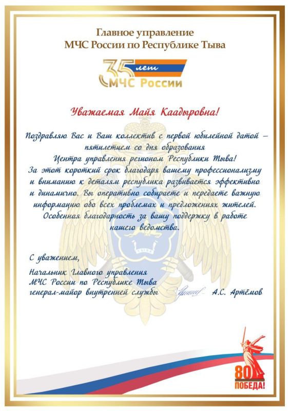 Начальник Главного управления МЧС России по Республике Тыва генерал-майор внутренней службы Алексей Серафимович Артёмов@mchstuvaПодписывайся на МЧС России в MAX | ВК