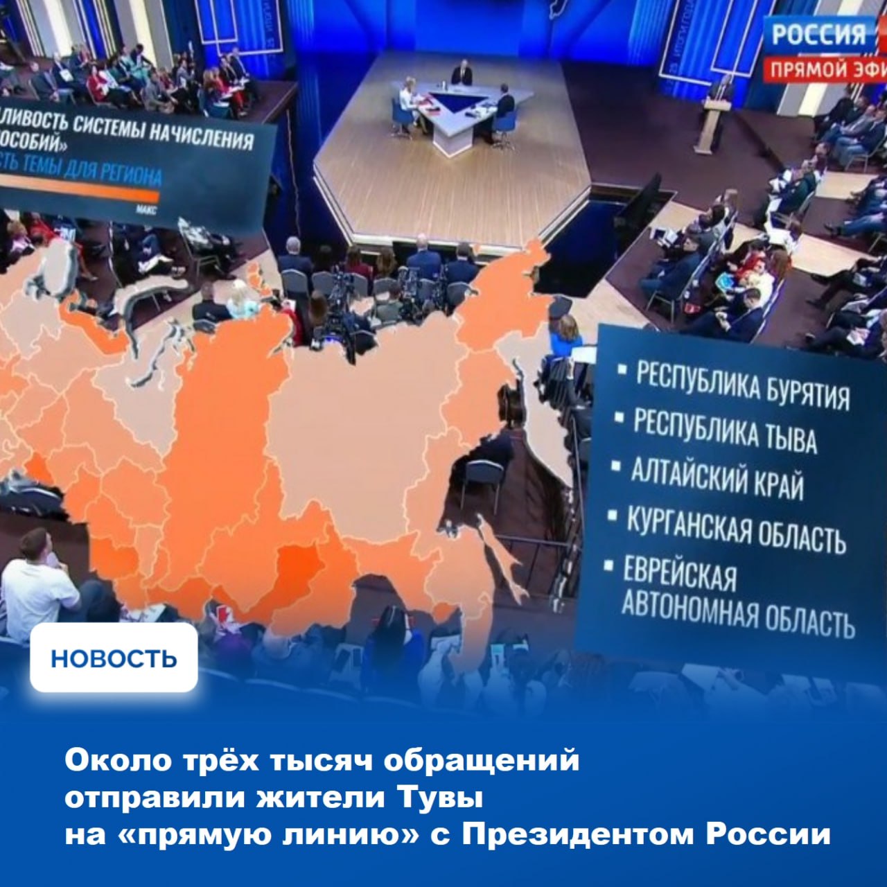 На «прямую линию» Президента России Владимира Путина, состоявшуюся 19 декабря, поступило около трёх тысяч обращений от жителей Республики Тыва. Об этом сообщил региональный исполком Общероссийского Народного фронта. Основные темы, которые волновали людей, касались социальной политики, вопросов жилья, специальной военной операции, экономики, государственного управления и общественной жизни, а также инфраструктуры.