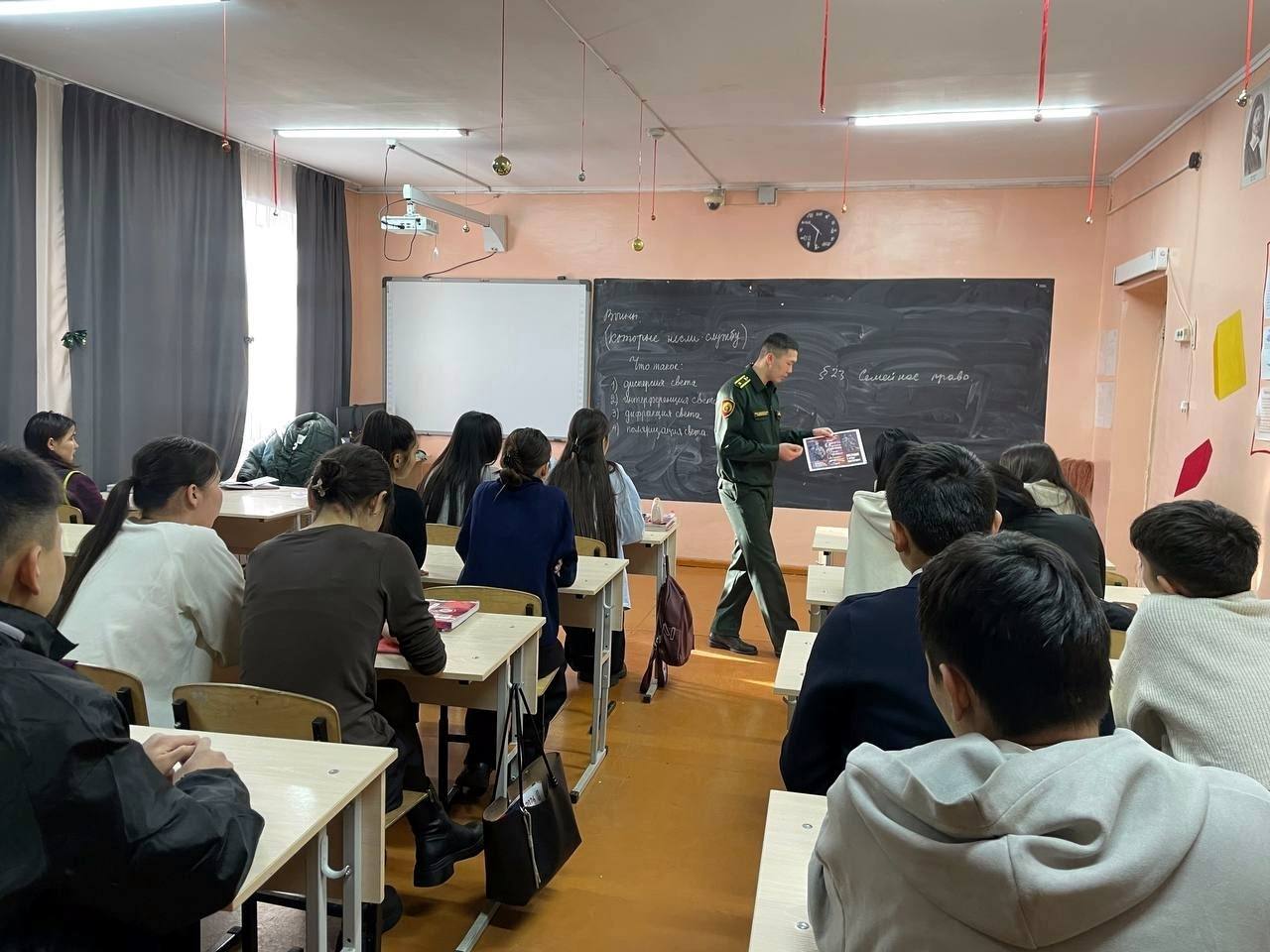 Школачылар улуг сонуургал-биле дынап, айтырыгларын салганнар. Курсантыны шериг дурт-сыны, ада-чуртчу, шыгыы чоруу, бедик билиглии база чугааккыры школачыларны хндткелин оттурган.