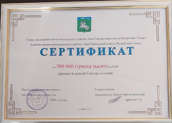 Администрация Бай-Тайгинского района отметила денежным сертификатом успехи 15-кратной чемпионки Республики Тыва по женской борьбе Алдынай Даржаа.