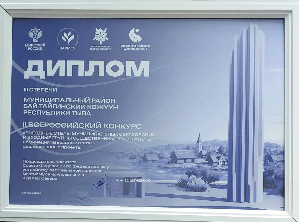 Бай-Тайгинский район удостоен диплома III степени в номинации «Въездные стелы. Реализованные проекты». Это признание на федеральном уровне стало результатом ответственного подхода к формированию архитектурного облика района. Въездная стела — первое, что видят гости. И проект района оказался в числе лучших в стране.