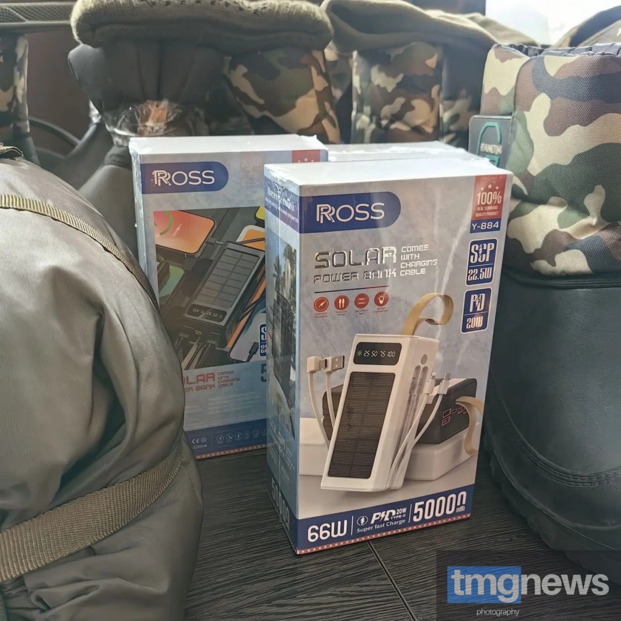 В состав помощи вошли резиновые ботинки, необходимые в условиях бездорожья и переменчивой погоды, обмундирование и спецодежда, а также портативные солнечные аккумуляторы для зарядки техники в полевых условиях.
