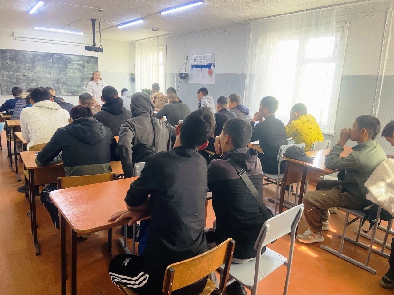 Тпт эмчилери Шагаан-Арыг хоорайда Тываны тудуг техникумуну салбырыны сургуулдарынга болгаш улуг класстарны реникчилеринге назы четпээн кижини сайзыралыны езинде скерлиишкиннерни дугайында тайылбырны чорудуп турар.
