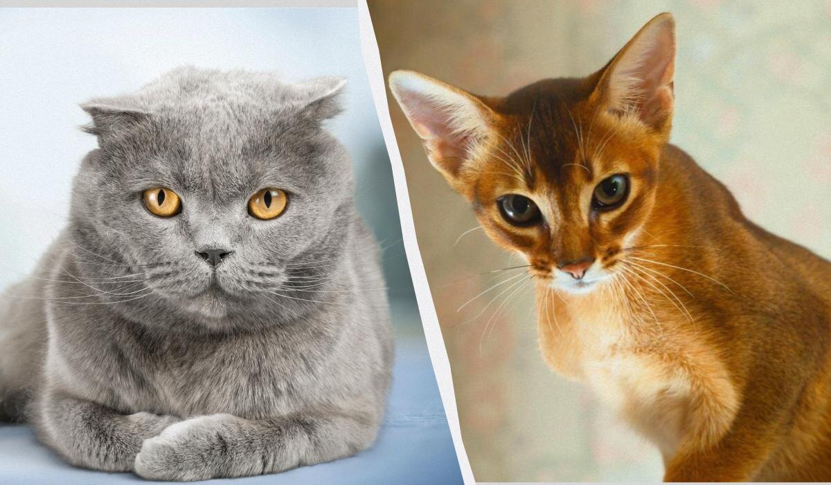 Британская короткошерстная кошка очаровывает густой плюшевой шерстью и необычной внешностью с большими глазами. Они отличаются спокойным, но ласковым характером: любят проводить время с хозяевами, но также не против поваляться в одиночестве. Абиссинская кошка — энергичный и игривый питомец с выделяющимся внешним видом. У неё крупные уши и красивые миндалевидные глаза, а также страсть к лазанию и играм.