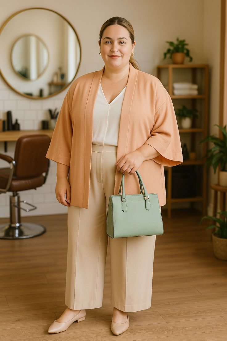 - Длинная черная блузка и светло-серые брюки: Модель с завышенной талией и неглубоким V-образным вырезом визуально стройнит фигуру, а прямые брюки добавляют элегантности и длины ног.