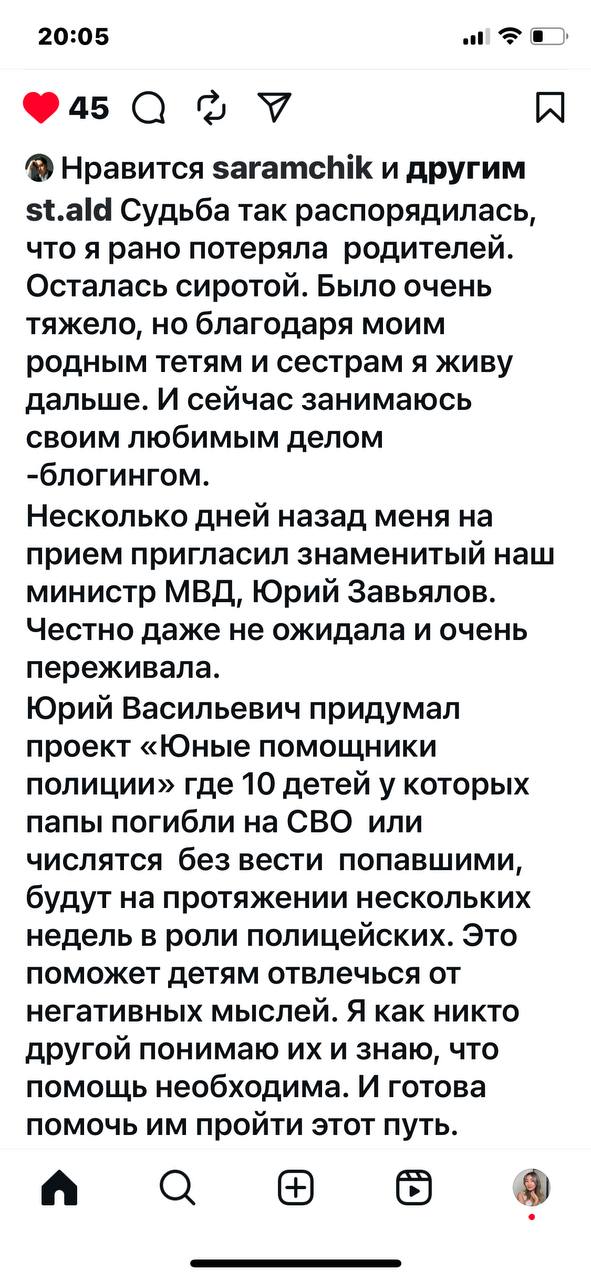 Судьба так распорядилась, что я рано потеряла родителей. Осталась сиротой. Было очень тяжело, но благодаря моим родным тетям и сестрам я живу дальше. И сейчас занимаюсь своим любимым делом -блогингом. Несколько дней назад меня на прием пригласил знаменитый наш министр МВД, Юрий Завьялов. Честно даже не ожидала и очень переживала. Юрий Васильевич придумал проект «Юные помощники полиции» где 10 детей у которых папы погибли на СВО или числятся без вести попавшими, будут на протяжении нескольких недель в роли полицейских. Это поможет детям отвлечься от негативных мыслей. Я как никто другой понимаю их и знаю, что помощь необходима. И готова помочь им пройти этот путь.