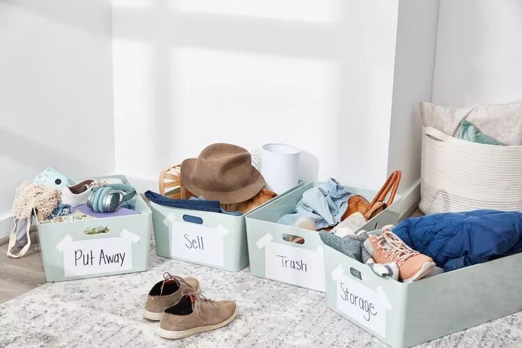- Первый контейнер: вещи, которые находятся не на своих местах, или те, что нужно убрать для длительного хранения.