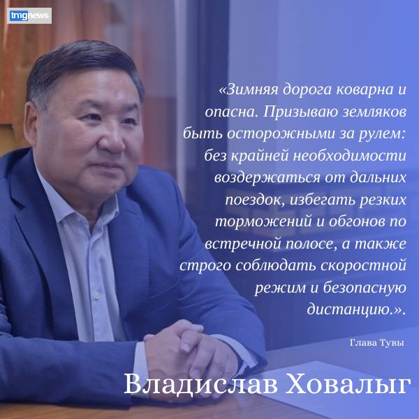 «В Туве зима уже вступает в свои права.Тувинский Центр по гидрометеорологии и мониторингу окружающей среды предостерегает нас, что еще ожидаются туман, гололедица на дорогах, снежные заносы, в горах местами усиление северо-западного ветра до 15-17 м/с, метель, а ночью в некоторых местах будет сильный снег. В горных районах республики лавиноопасно. Зимняя дорога коварна и опасна. Призываю земляков быть осторожными за рулем: без крайней необходимости воздержаться от дальних поездок, избегать резких торможений и обгонов по встречной полосе, а также строго соблюдать скоростной режим и безопасную дистанцию», - отметил Глава республики.