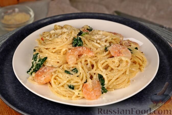 - Спагетти с креветками и шпинатом – Ароматные спагетти обволакиваются нежным сливочным соусом, в который добавлены креветки и свежий шпинат, создавая идеальное сочетание.
