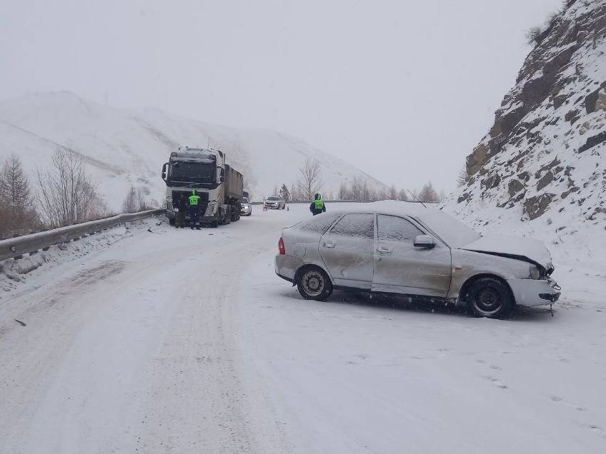 Дорожно-транспортное происшествие с двумя пострадавшими произошло 24 ноября на 771-м километре федеральной трассы Р-257 «Енисей». По информации Госавтоинспекции МВД по РТ, 23-летний житель Кызыла, находившийся за рулем автомобиля «Лада Приора», не справился с управлением и выехал на полосу встречного движения, где совершил лобовое столкновение с грузовиком «Вольво».