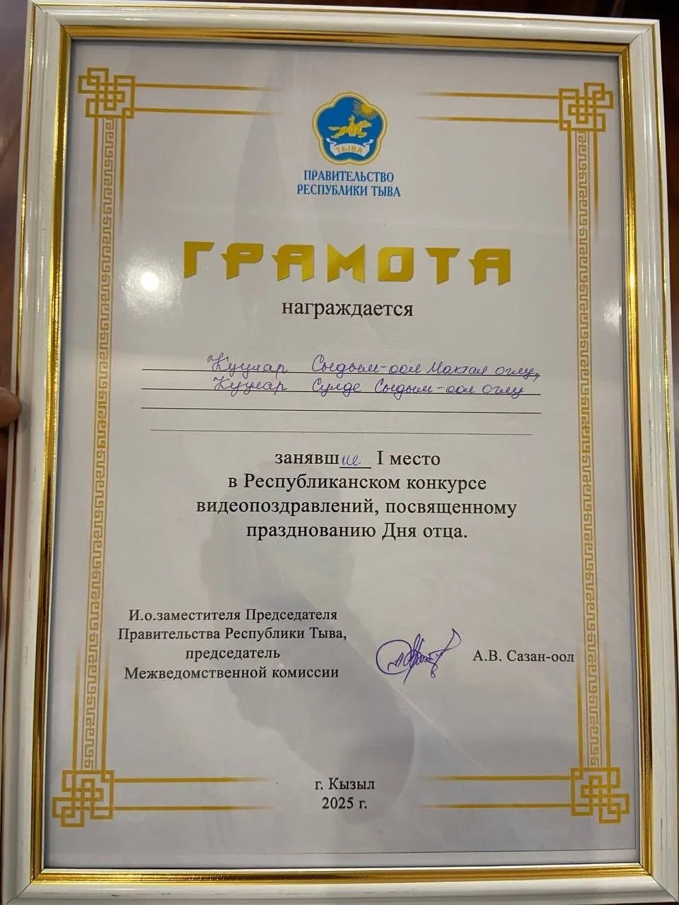 Чаа-Хл кожуундан Кууларларны г-блези – адазы Сыдым-оол Мактал оглу биле оглу Слде бирги черни ээлээш, хндлел бижикти, 5000 рубль акша шаналын база Тываны В. Кк-оол аттыг Национал хгжм-шии театрынче алды билетти алганнар.