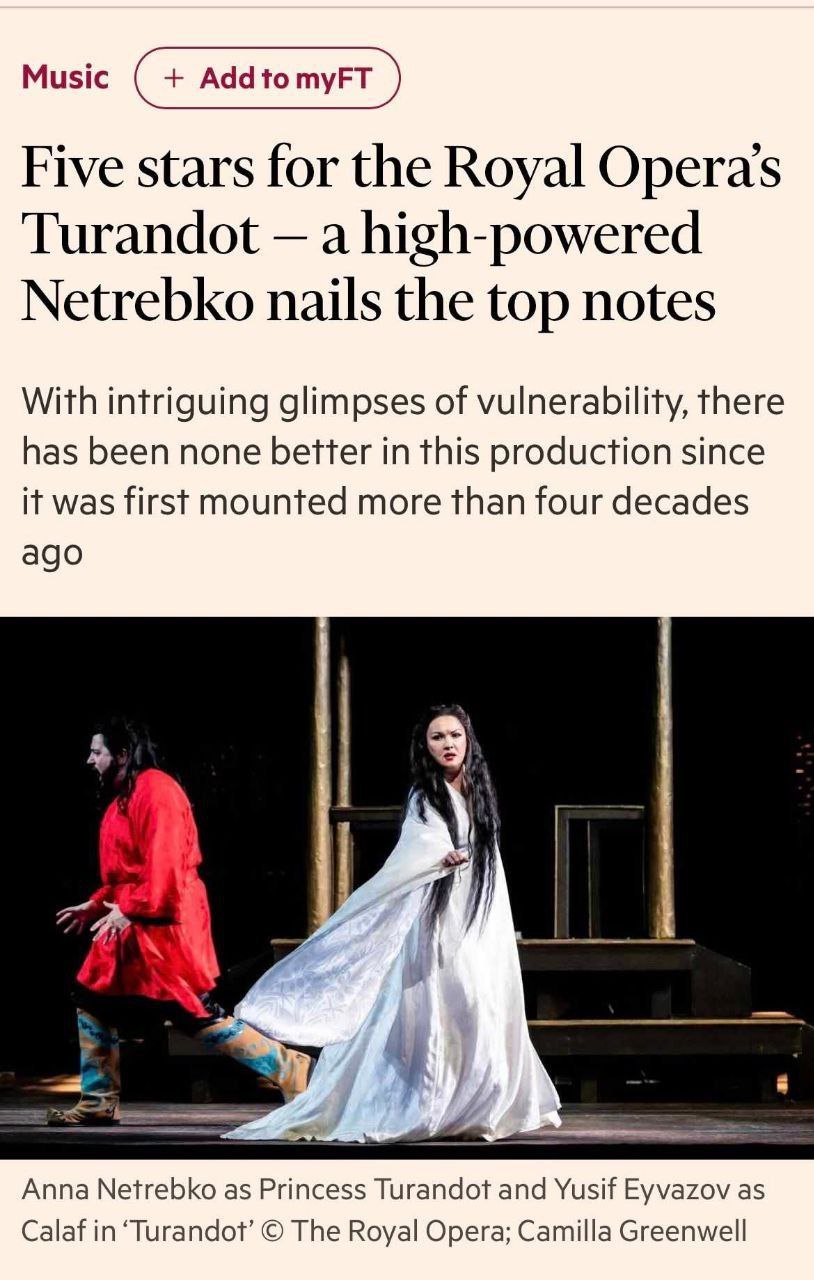 "Пять звёзд для «Турандот» Королевской оперы - мощная Нетребко безупречно берёт верхние ноты.