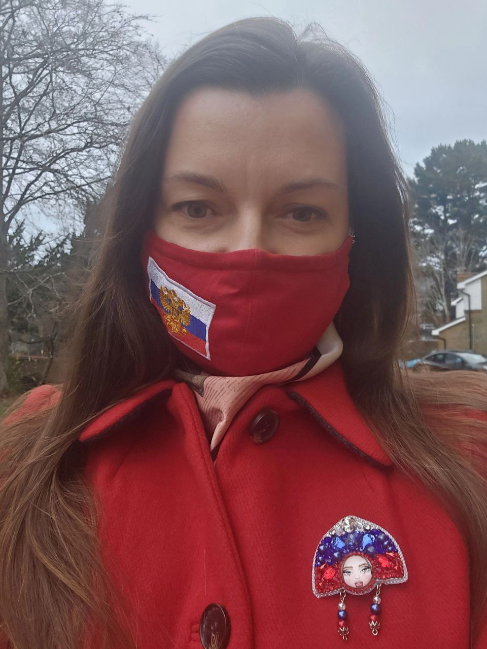 Прошлась не просто так, а в маске с двухглавым орлом на российском знамени и с шикарной брошью - девочкой в кокошнике в цветах российского триколора. Заукраинцы такого явно не ожидали.