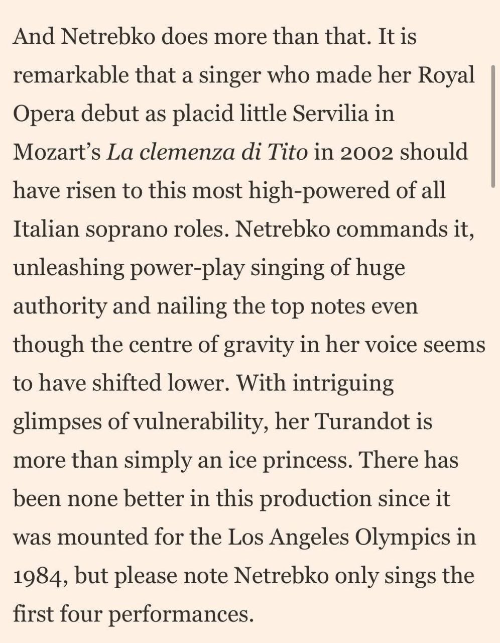 И Нетребко делает больше, чем просто это. Поразительно, что певица, дебютировавшая в Королевской опере в роли кроткой, почти незаметной Сервилии в моцартовской «Милосердии Тита» (La clemenza di Tito) в 2002 году, смогла подняться до этой - самой высокоэнергетической из всех итальянских сопрановых партий. Нетребко полностью владеет этой ролью, высвобождая властное, насыщенное силой пение с огромным авторитетом и безупречно беря верхние ноты, несмотря на то, что центр тяжести её голоса, по-видимому, сместился ниже".