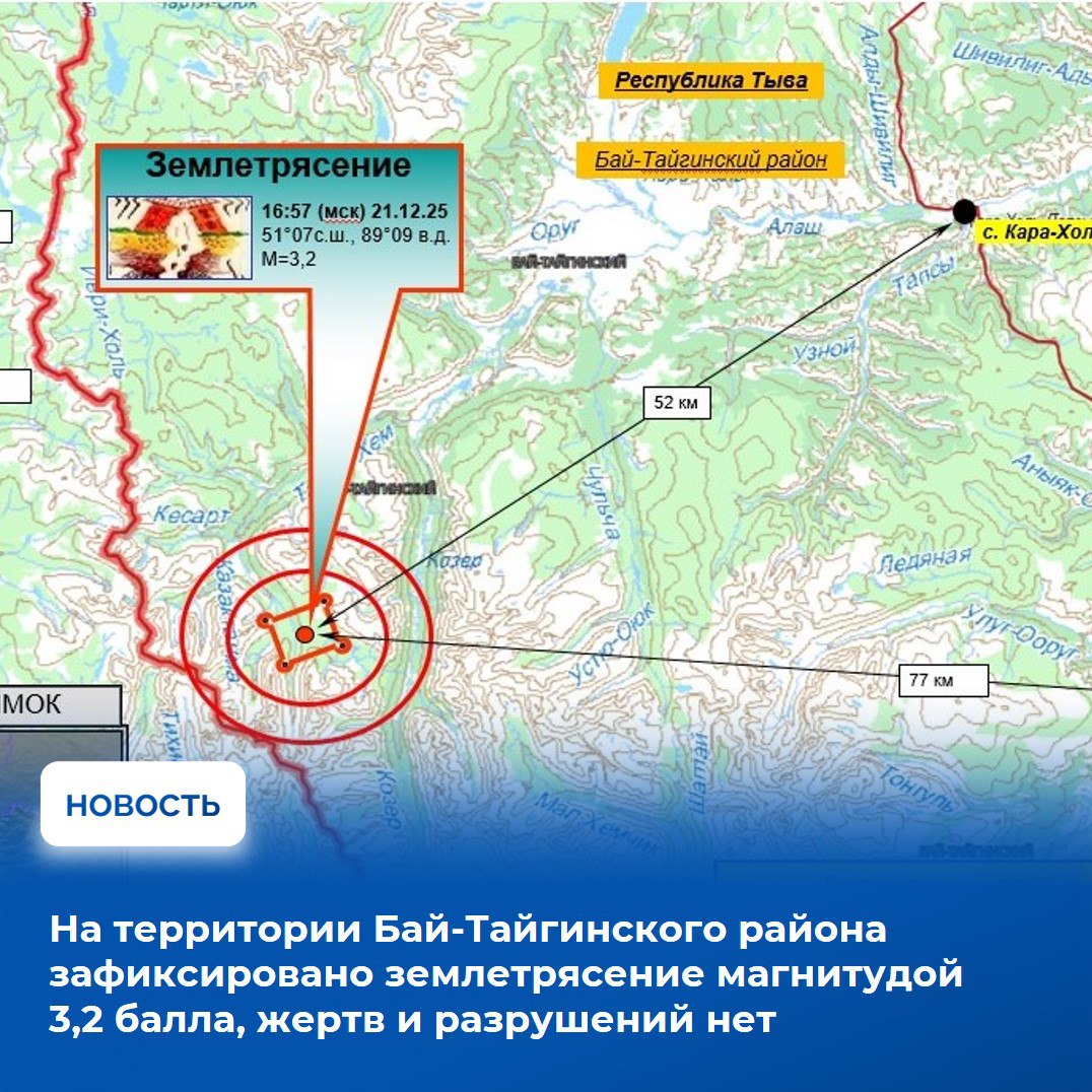 По информации Главного управления МЧС России по Республике Тыва, за последние семь дней чрезвычайных ситуаций в регионе не произошло. На контроле управления находятся мероприятия по ликвидации последствий выхода наледевых вод в г. Чадане. По состоянию на 22 декабря угрозы подтопления жилых домов и социальных учреждений нет. Межведомственными силами удалось отвести воды реки Чадан в основное русло.