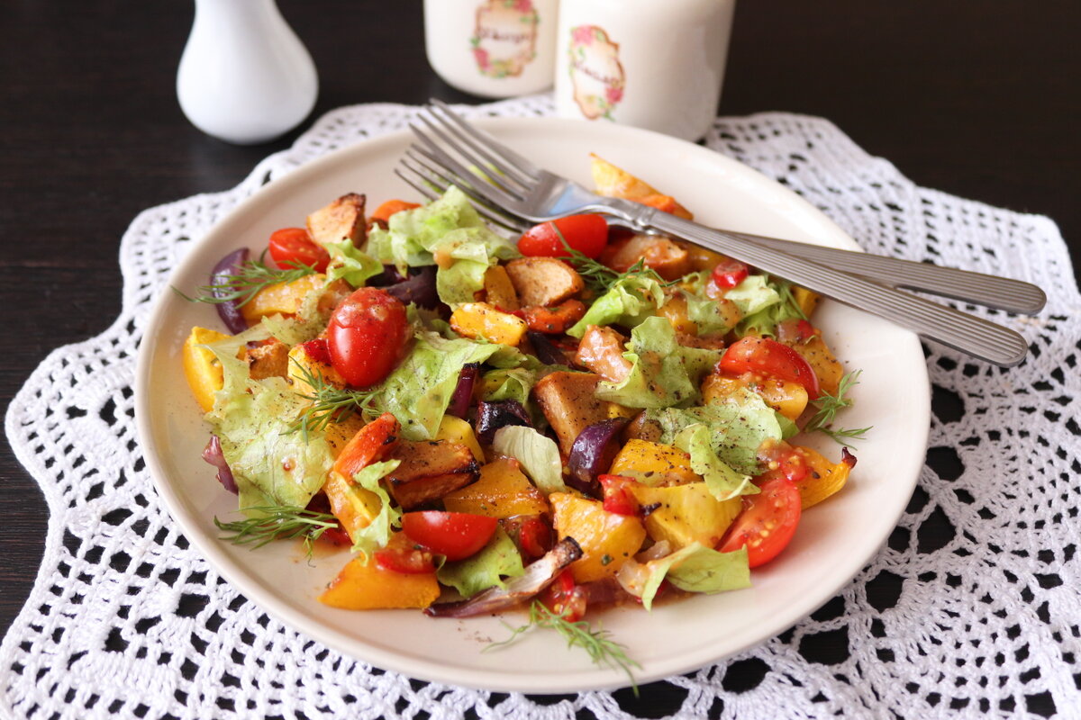 Когда овощи будут готовы, их стоит выложить на тарелку и полить половиной заправки. Листья зеленого салата нужно порвать на кусочки, а помидоры черри разрезать пополам. Все ингредиенты смешиваются, и оставшаяся заправка добавляется в салат. Вот и все — можно подавать на стол!