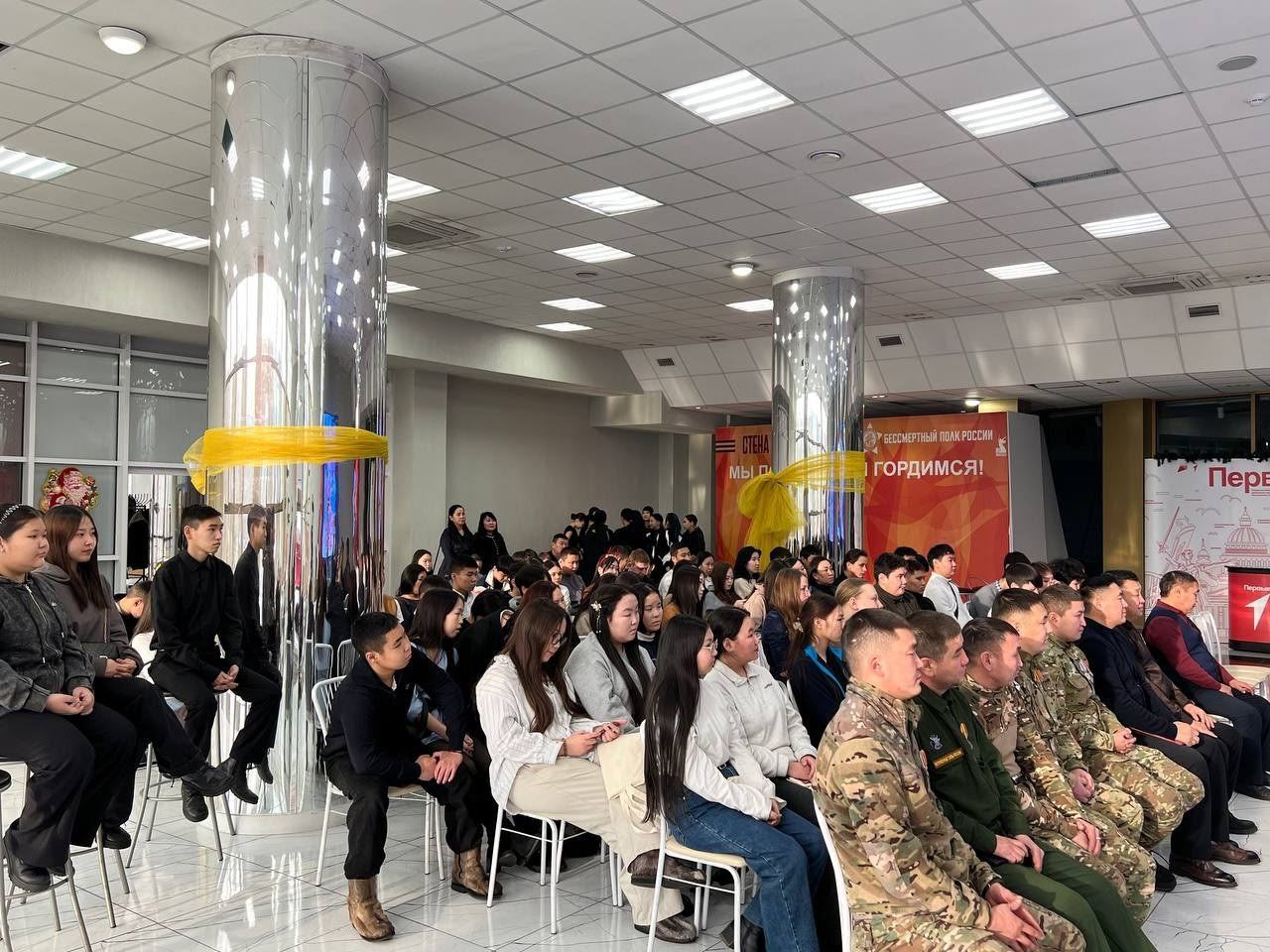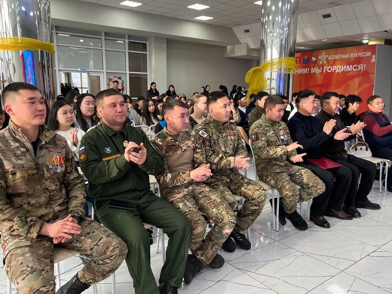 От имени всех военнослужащих участников СВО студентов поздравил Герой России, министр по делам молодёжи Республики Тыва Буян Куулар.