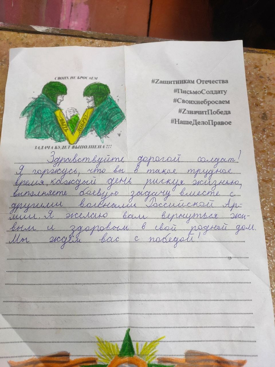 Одно из писем оказалось в руках военнослужащего из села Самагалтай. Солдат бережно хранил детское письмо с теплыми словами поддержки, которые были очень важны и помогали в трудные моменты, напоминая о малой родине.