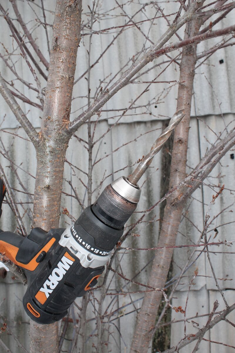 Чтобы начать, необходимы следующие инструменты: садовый нож, вар для деревьев, секатор, дрель и спиральное сверло. После подготовки всего необходимого, требуется нарезать черенок, размер которого должен совпадать с диаметром сверла. Далее, следует тщательно осмотреть ствол дерева, отобрав здоровый участок для прививки.