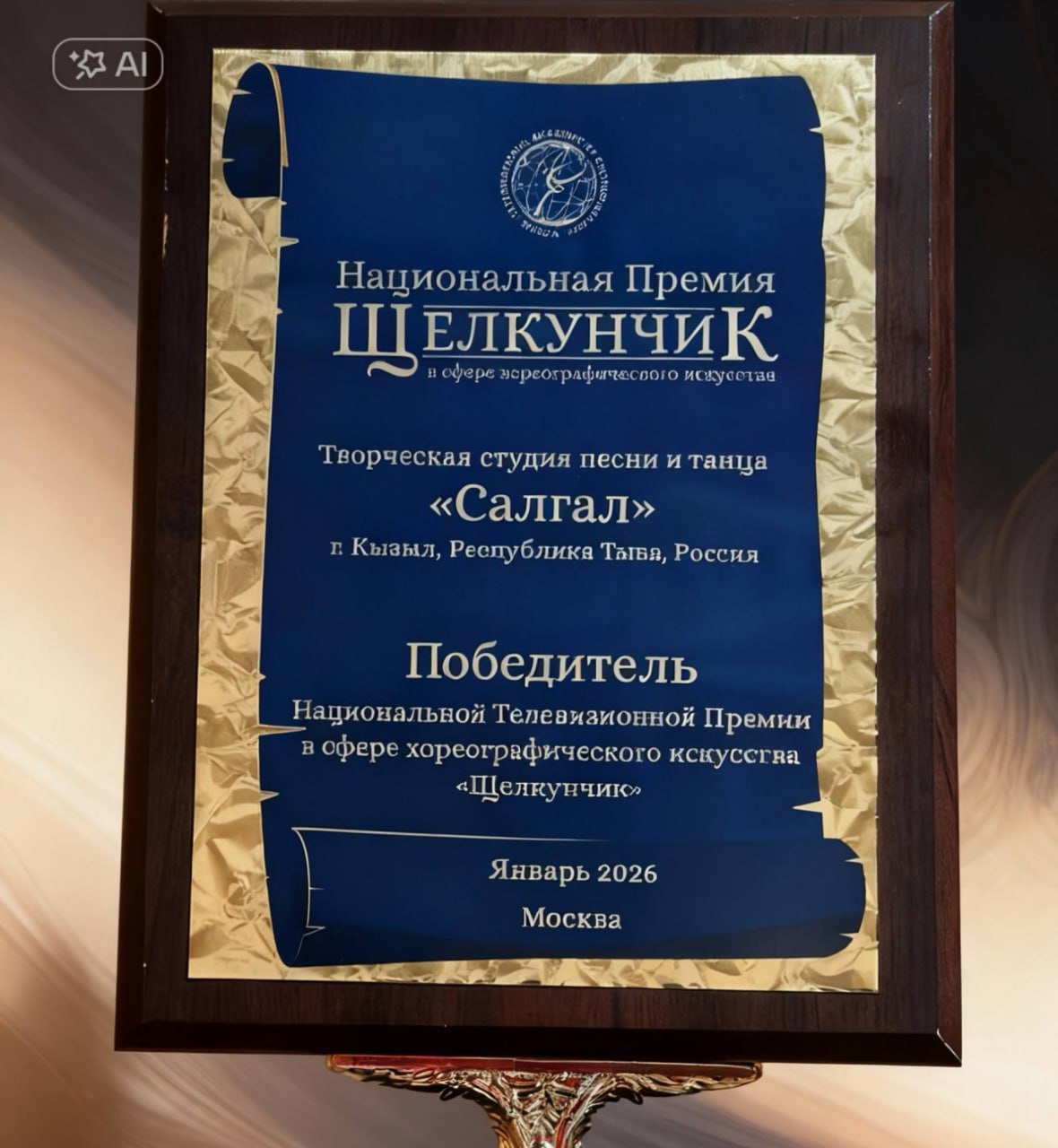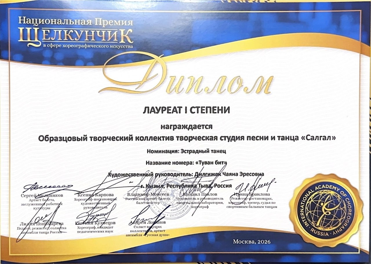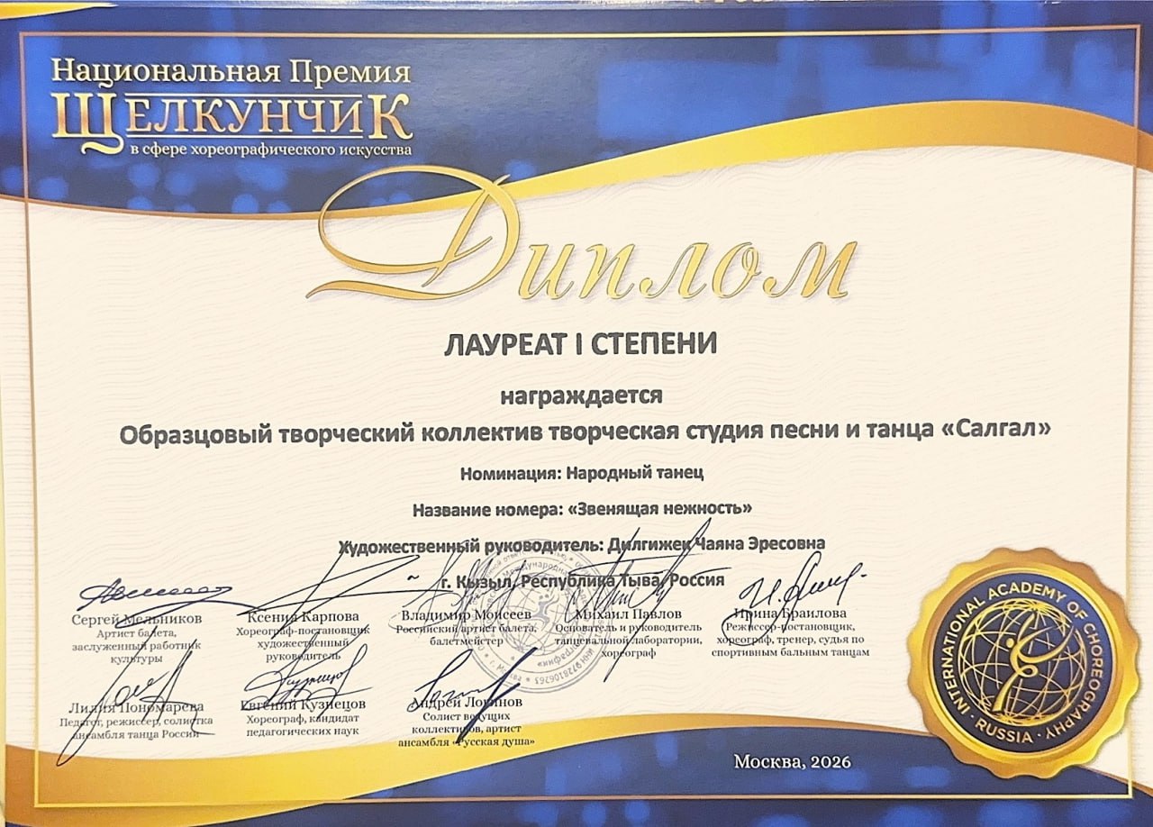 Студия песни и танца «Салгал» под руководством Чаяны Дилгижек стала лауреатом I степени Национальной телевизионной премии «Щелкунчик». Мероприятие проходило с 10 по 13 января в Москве в одноименном Большом концертном зале. В этом году в нем приняли участие 200 хореографических коллективов со всех регионов страны.