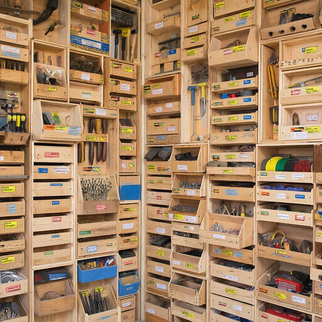 Для тактильного восприятия ручки на ящиках выполняются в разных формах. Кольца для мелкого крепежа, широкие планки для электроинструмента, а также две ручки-скобы для садового инвентаря. Это позволяет находить нужные ящики даже с закрытыми глазами или в перчатках.