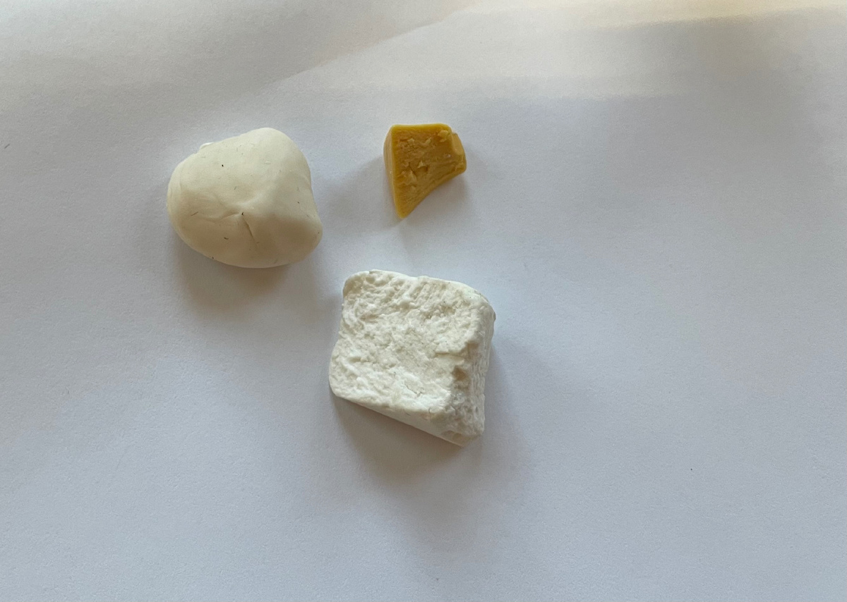 Для создания картошки пригодится полупрозрачная белая запекаемая пластика и обычная белая глина. Эти материалы понадобятся в равных пропорциях, а также потребуется небольшой кусочек пластики песочного цвета. Например, для работы могут использоваться цернит полупрозрачного цвета и обычная белая глина, а также песочная артефакт.