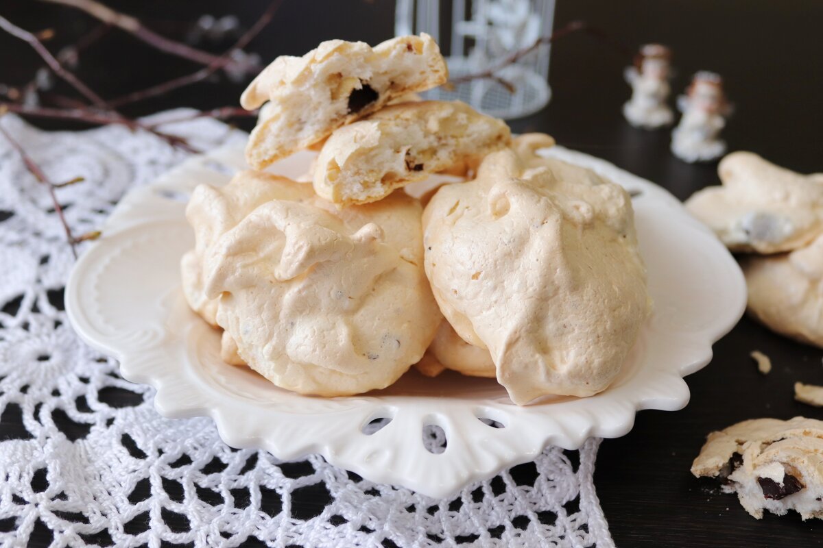Пока белки взбиваются, поджарьте орехи и поломайте шоколад на кусочки. Затем аккуратно добавьте орехи и шоколад в белковую массу, перемешивая снизу вверх.