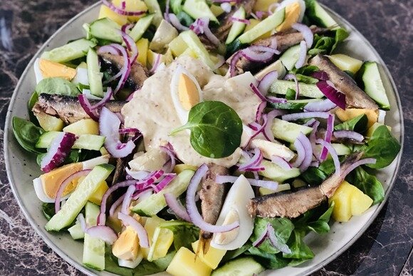 - Простой салат со шпротами: Этот легкий и питательный салат включает картофель, вареные яйца, огурцы и хрустящий красный лук. В качестве акцента добавьте шпроты и получите изысканное угощение для семейного ужина.