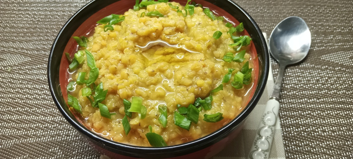 Чечевица распознаётся по мягкости и лёгкому ореховому оттенку, а зелёный лук добавляет свежесть и лёгкую пикантность. База из растительного масла подчеркивает естественный вкус крупы и делает блюдо завершённым без лишних штрихов.