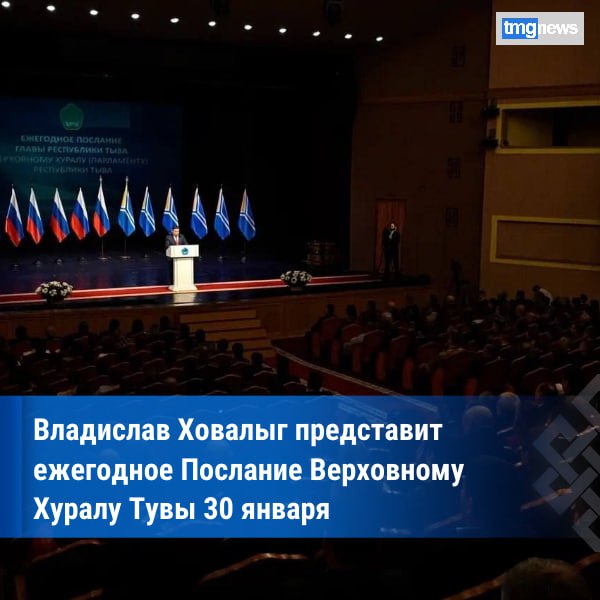 Глава Республики Тыва Владислав Ховалыг представит ежегодное Послание Верховному Хуралу (парламенту) республики. Трансляция запланирована на 30 января в 11:00 на официальной странице Главы республики в социальной сети «ВКонтакте».