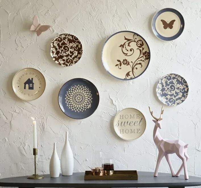 При размещении тарелок на стене важно не попадать в ловушку симметрии. Стены должны быть оформлены так, чтобы тарелки казались «разбросанными» в случайном, но гармоничном порядке. Рекомендуется ставить большие тарелки в центре, окружая их меньшими экземплярами, слегка смещая их по вертикали для создания динамики.