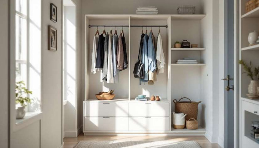 Одежду следует складывать вертикально, чтобы всё было видно и доступно. Такой подход облегчает визуальную сортировку и экономит пространство.