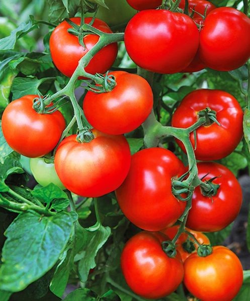 Плоды представляют собой плоскоокруглые томаты с ярко-красной кожицей, достигающие крупных размеров. Они содержат плотную, мясистую мякоть с минимальным количеством жидкости и семян, что придает им отличный вкус и делает их идеальными для свежего потребления или переработки.