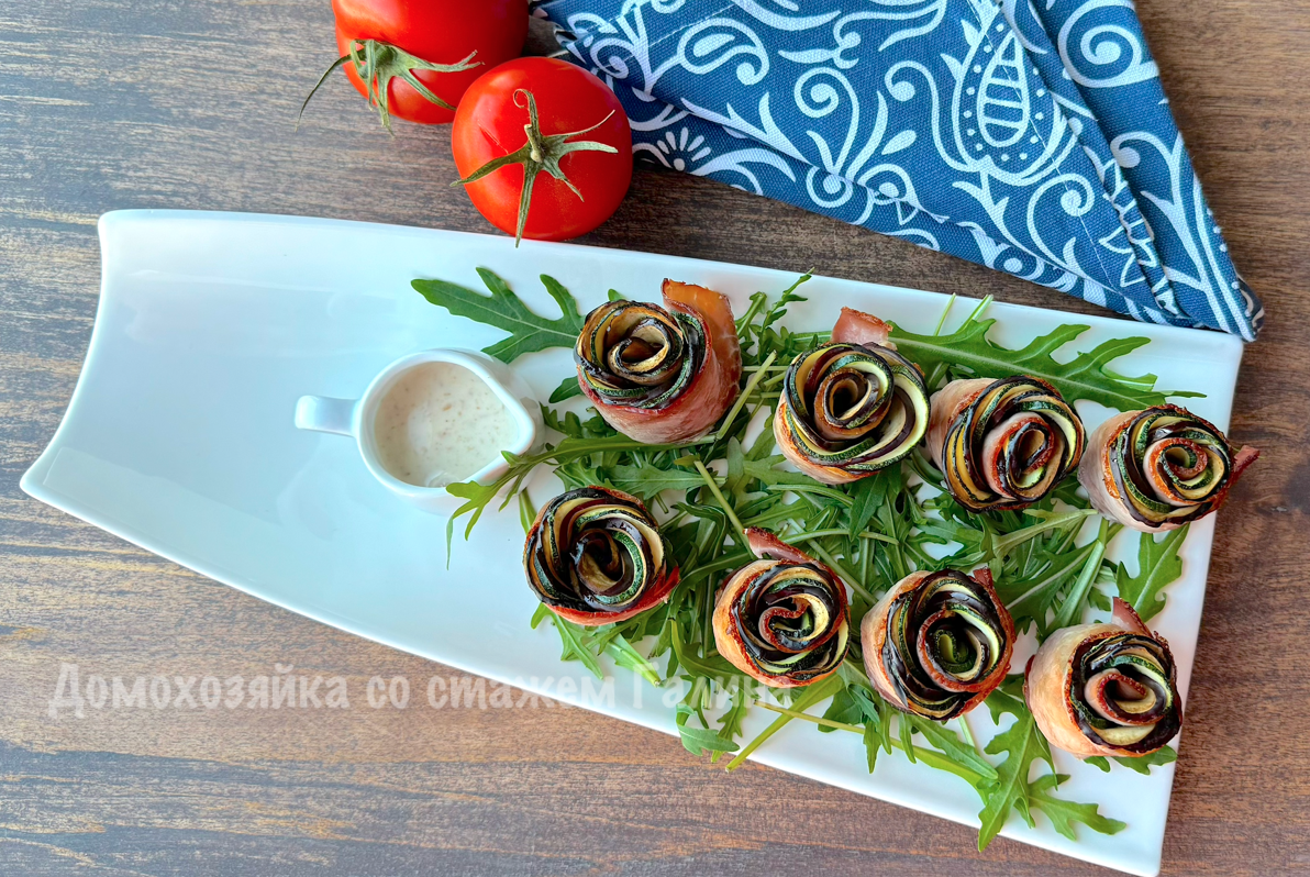 Приготовление рулетиков с овощами включало нарезку баклажанов и цукини на тонкие ломтики. Мясо не нуждалось в дополнительной соли, поскольку бекон уже достаточно соленый. Затем ингредиенты сворачивались в рулетики и крепились шпажкой. Заготовки помещались в огнеупорное блюдо, можно было добавить заливку из сметаны и яиц, чтобы получить более сочное блюдо, но в этот раз выбрали другой путь.