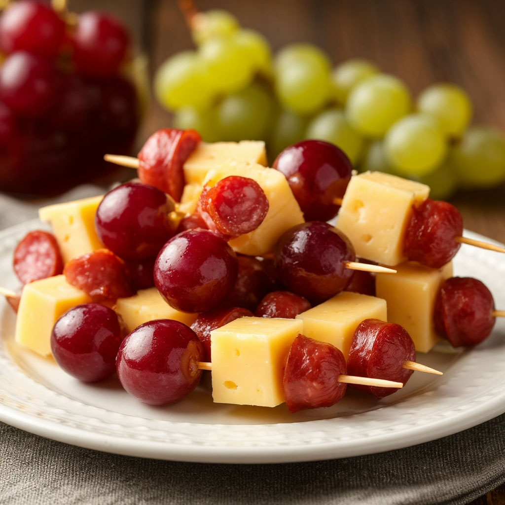 - Шашлычки с сыром и виноградом: Это простая и элегантная закуска. Необходимы лишь твердый сыр, виноград без косточек и мини-колбаски. Всего за несколько минут можно подготовить аппетитные шпажки, которые станут настоящим украшением стола.