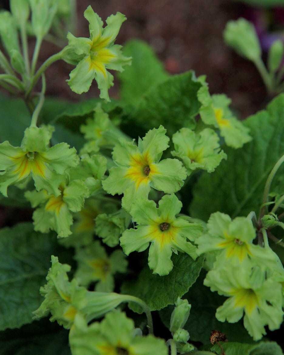Примула 'Francesca' привлекает внимание не только своим цветом, но и размером. Высота растения достигает 30 см, а цветки с желтым глазком в центре, со временем белеющим, создают эффект изысканных рюшечек. Она цветет с конца мая до конца июня, привнося в сад яркие нотки свежести на фоне зелени.