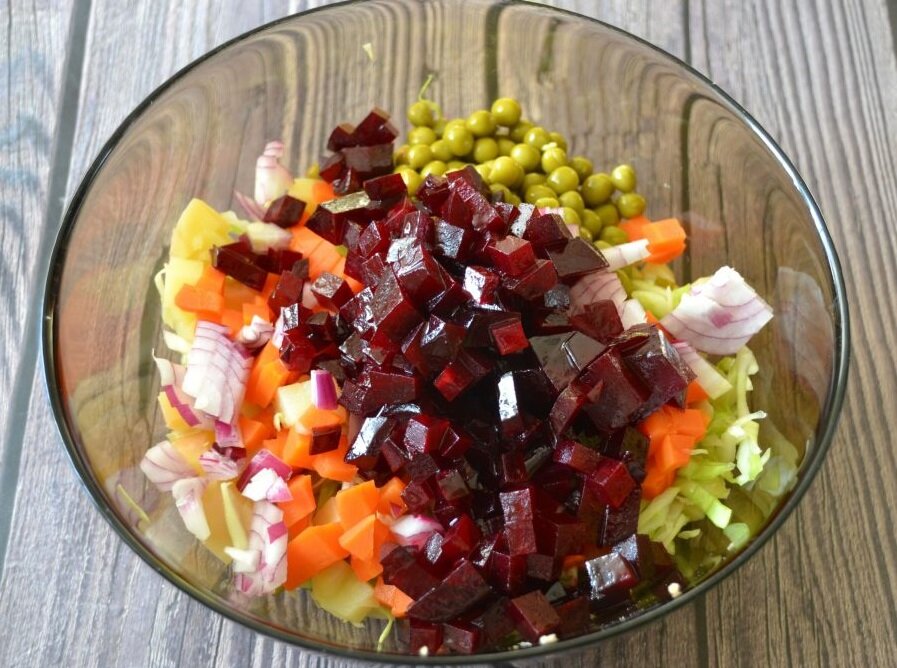 Важно добавить свеклу в последний момент: таким образом, она не окрасит остальные компоненты, и винегрет будет выглядеть аппетитно и нарядно.