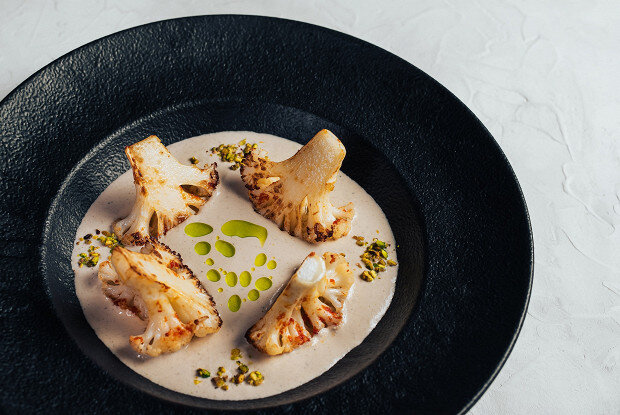 Перед подачей соус сациви немного подогреть, чтобы он стал теплым, но не горячим.В центр тарелки выложить соус, сверху разместить цветную капусту и посыпать рублеными фисташками.Этот яркий и питательный рецепт станет настоящим украшением вашего стола. Прекрасно подходит как в качестве закуски, так и основного блюда!