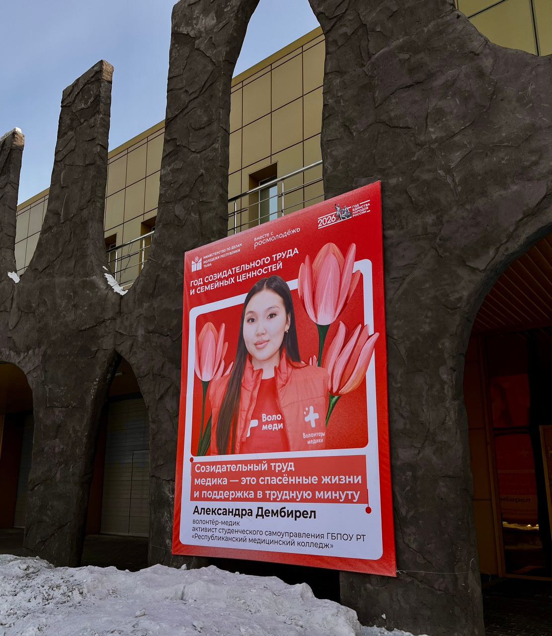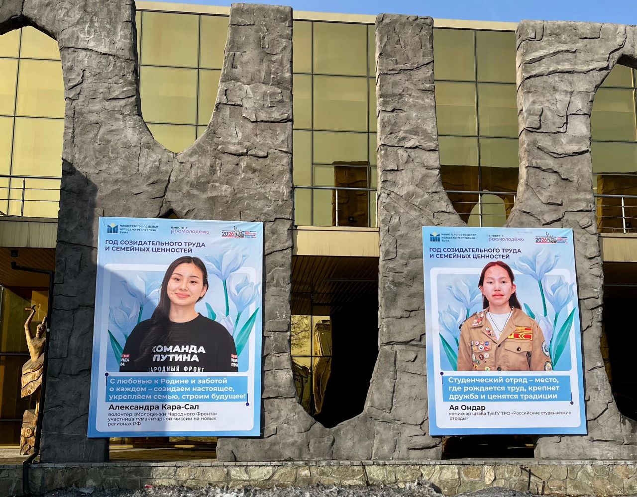 Оформление приурочено к 8 Марта, а также к Году созидательного труда и семейных ценностей в Туве. На баннерах размещены фотографии девушек-активисток республики.