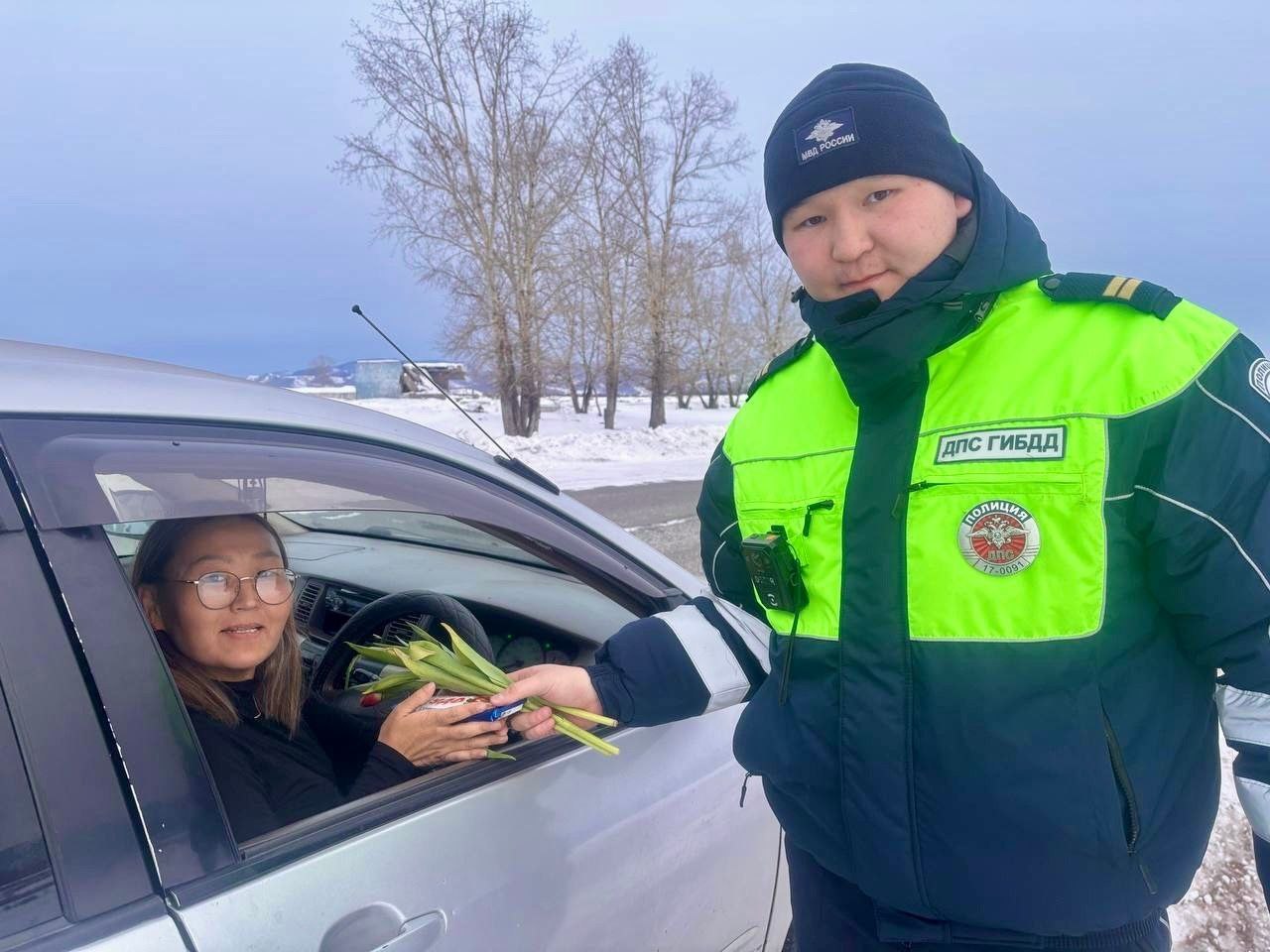 В городе Шагонар, селах Хайыракан и Балгазын экипажи ДПС останавливали автомобили под управлением женщин, чтобы поздравить их с праздником. Инспекторы вручали автоледи тюльпаны и напоминали о важности соблюдения правил дорожного движения.