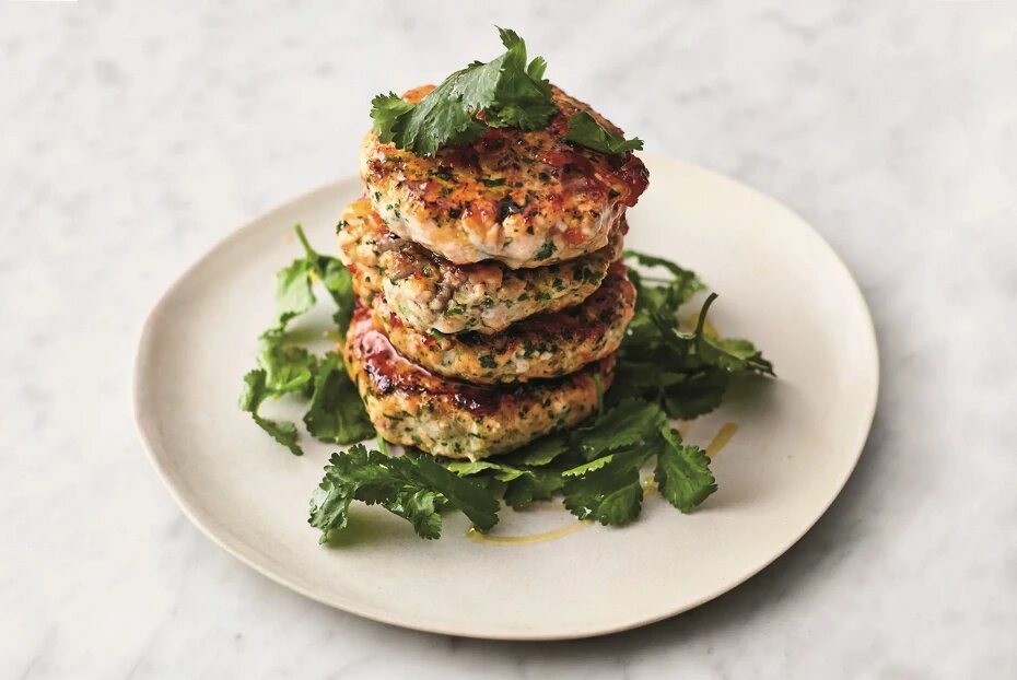На большой разделочной доске раздавить лимонное сорго, сняв с него жесткий слой. Очистить имбирь и нарезать его мелкими кусочками вместе с внутренней частью сорго и большей частью кинзы. Оставшиеся листья можно замочить в холодной воде.Филе семги нарезать на кусочки размером в 1 см, положив их поверх ароматной смеси. Затем половину рыбы сдвинуть к краю доски. Остальную семгу мелко порубить, пока не получится пастообразная масса, и тщательно перемешать с первой половиной, приправив солью и перцем. Сформировать 4 котлетки толщиной около 2 см.На среднем огне разогреть большую сковороду с антипригарным покрытием, влить оливковое масло. Обжаривать котлеты по 2 минуты с каждой стороны, до появления золотистой корочки. Затем добавить джем из чили, немного воды в сковороду, выключить огонь и аккуратно перемешать соус.Подача блюда