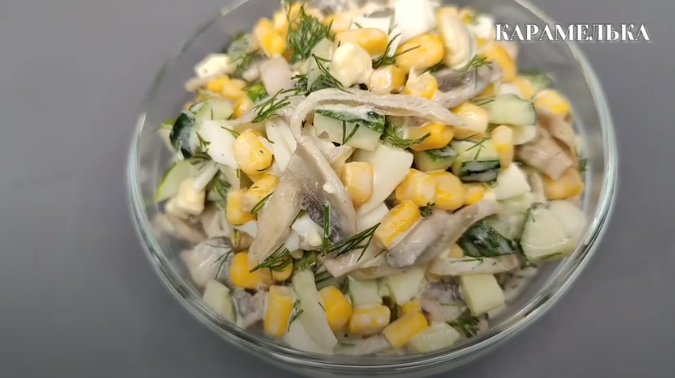 Когда все ингредиенты готовы, нужно их соединить. В глубокой миске аккуратно смешиваются остывшие грибные кусочки, яйца, нарезанный огурец, консервированная кукуруза и лук. В завершение добавляется мелко нарезанный укроп, придающий салату неповторимый аромат и свежесть.